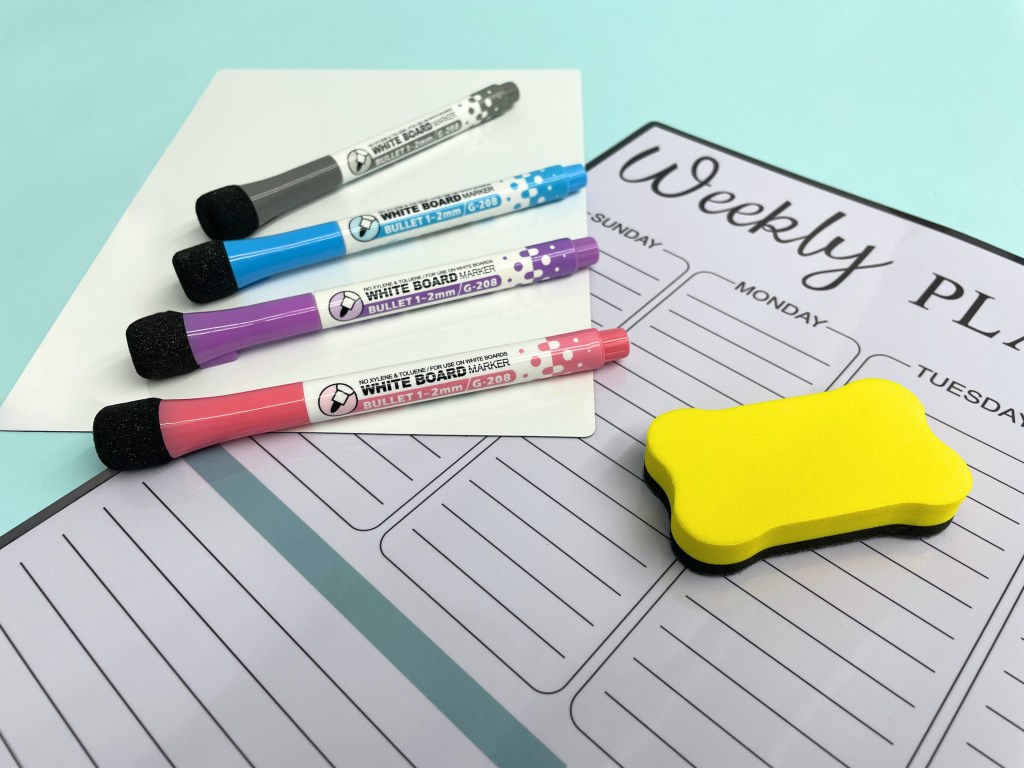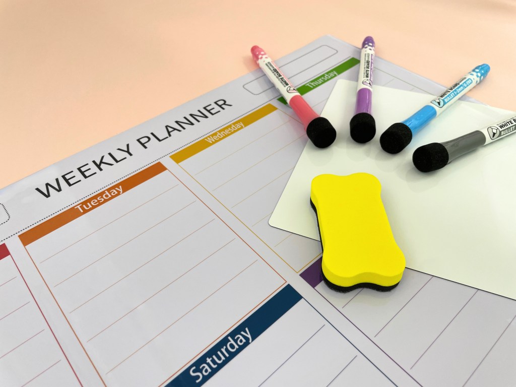 The fine-grid weekly planner is ideal for managing weekly schedules, also helping children be organized and responsible for important dates and events. It comes with everything you need—1 planner, 1 blank memo board, 4 fine-tip markers, and 1 dry eraser.